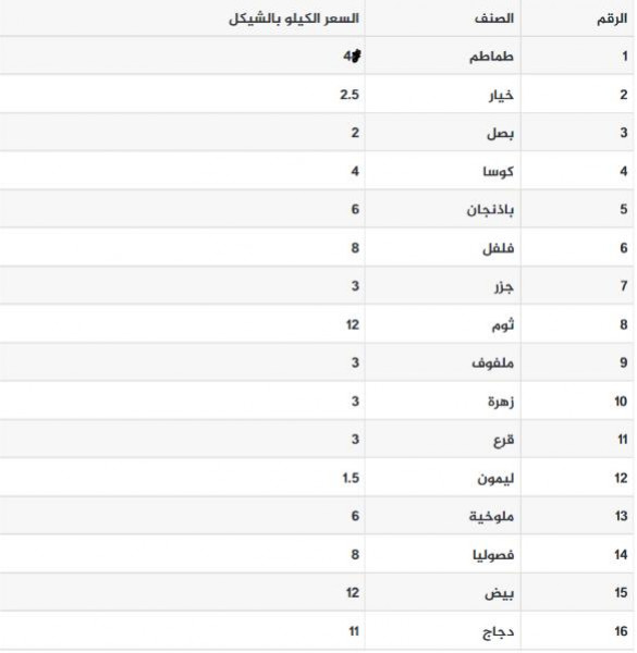 إليكم متوسط أسعار المنتجات الزراعية بالشيكل كما أعلنتها وزارة الزراعة بغزة:
