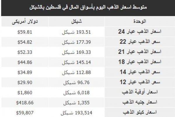 أسعار الذهب في أسواق فلسطين