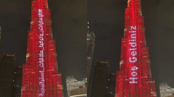 ووفق موقع (يني شفق) التركي فقد ترافقت إضاءة البرج الذي يعتبر الأعلى في العالم ويقع وسط دبي، مع عزف النشيد الوطني التركي، كما أضاء البرج بعبارة "Hoş geldiniz" (أهلا بكم) باللغة التركية، إضافة إلى عبارة "الإمارات وتركيا علاقات استراتيجية" باللغتين العربية والإنجليزية.