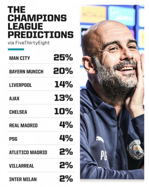 وتبلغ فرص "السيتي"، الذي بلغ نهائي النسخة الماضية، في الفوز بدوري الأبطال هذا الموسم، 25 بالمئة وفقا لـ "fivethirtyeight".