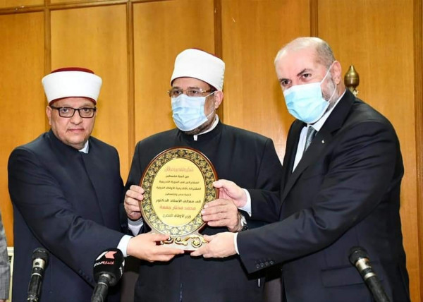 كرم الدكتور محمود الهباش والدكتور محمد مختار جمعة وزير الأوقاف في جمهورية مصر العربية، والشيخ حاتم البكري وزير الأوقاف والشئون الدينية ، الأئمة من مصر وفلسطين المشاركين في الدورة التدريبية المشتركة اليوم الثلاثاء 15/ 2/ 2022م بالمجلس الأعلى للشئون الإسلامية بجاردن سيتي في العاصمة المصرية القاهرة.