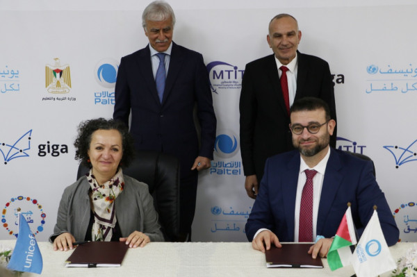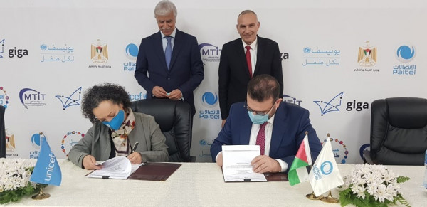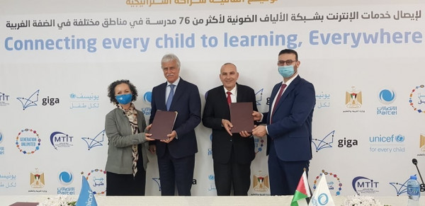 وقعت وزارتا التربية والتعليم والاتصالات وتكنولوجيا المعلومات وشركة الاتصالات الفلسطينية (بالتل) ومنظمة اليونيسف، اليوم الخميس، اتفاقية شراكة استراتيجية تهدف لربط 76 مدرسة في الضفة الغربية بالإنترنت؛ لتمكين ما يقرب من 10,000 طالب وطالبة و 1,000 معلم ومعلمة من الوصول إلى مصادر التعليم عبر الإنترنت.