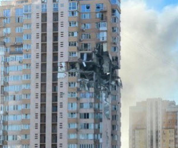 ويظهر في مقطع مصور المبنى السكني، وقد تعرض لأضرار بسبب قصف صاروخي روسي للمبنى.