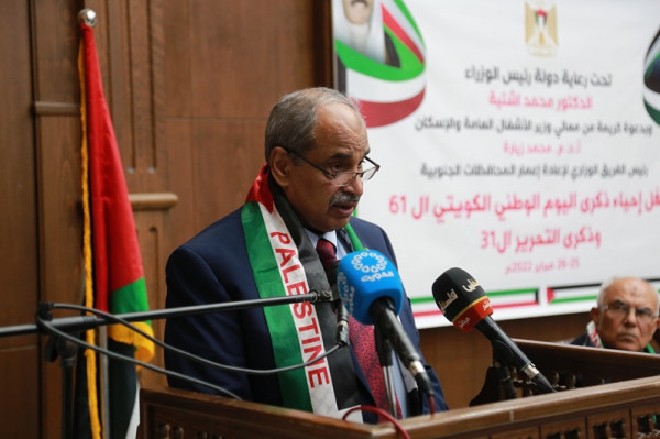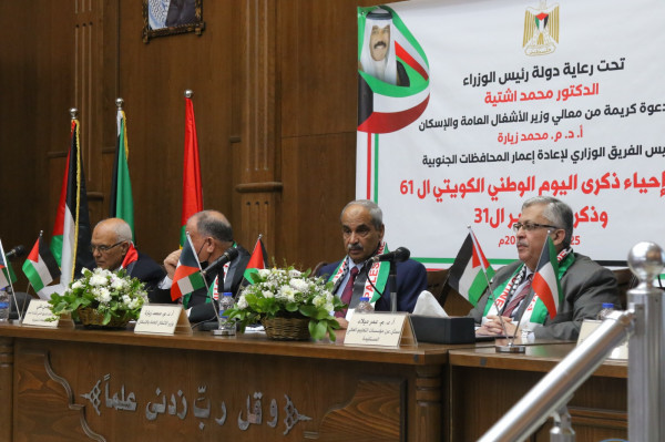 نظّمت وزارة الأشغال العامة والإسكان احتفالًا في مدينة غزة لإحياء ذكرى اليوم الوطني الكويتي الواحد والستين وذكرى التحرير الواحدة والثلاثين، وذلك تحت رعاية دولة رئيس الوزراء الدكتور محمد اشتية، وبحضور كل من وزير الأشغال العامة والإسكان ورئيس الفريق الوزاري لإعادة إعمار المحافظات الجنوبية، د. محمد زيارة، و رئيس جامعة الأزهر د. عمر ميلاد ، ومنسق الفريق الفني لإعادة الإعمار م. سعدي علي، وممثل الفريق الاستشاري لإعادة الإعمار م. علي أبو شهلا ، ود. سمير أبو جياب ممثلا عن مؤسسات ذوي الاحتياجات الخاصة المستفيدة من المنحة الكويتية، وأعضاء الفريقين الفني والاستشاري، وعدد من محافظي المحافظات الجنوبية، وممثلين عن الوزارات والجامعات والمؤسسات المستفيدة من المنحة الكويتية، ولفيف من الشخصيات الاعتبارية والقيادية.