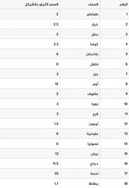 جاءت أسعار الخضروات والفواكه والدجاج واللحوم في قطاع غزة، اليوم الأحد، كما يلي: