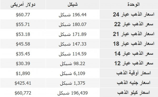 جاءت أسعار الذهب في أسواق فلسطين، صباح اليوم الأحد، مقابل الدولار والشيكل، على النحو التالي: