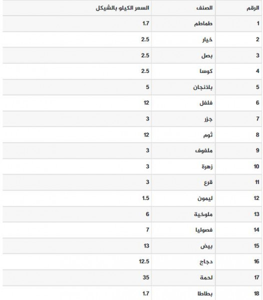 جاءت أسعار الخضروات والفواكه والدجاج واللحوم في قطاع غزة اليوم الخميس، كما يلي:
