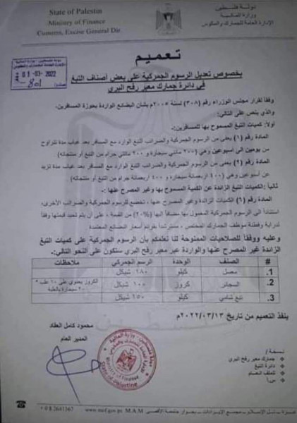 وأفادت الإدارة العامة للجمارك، بأن الرسم الجمركي على كيلو المعسل 180 شيكل، بعدما كان 130 شيكل، والرسم الجمركي على (كروز) السجائر 100 شيكل، وذلك بدلاً من 80 شيكل.