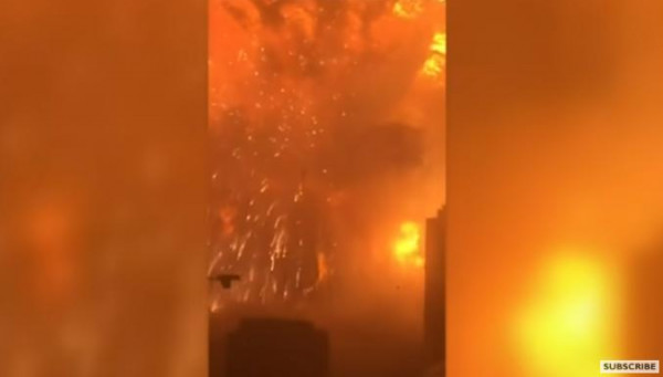 ويعود الفيديو لحريق اندلع في مصنع مواد كيميائية في تيانجين الصينية عام 2015.