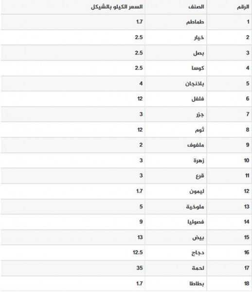 جاءت أسعار الخضروات والدجاج واللحوم في قطاع غزة اليوم الثلاثاء، كما يلي: