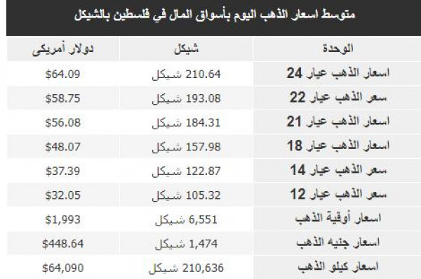 سُجلت أسعار الذهب في أسواق فلسطين، اليوم الثلاثاء، فقًا للشيكل الإسرائيلي والدولار، على النحو التالي:
