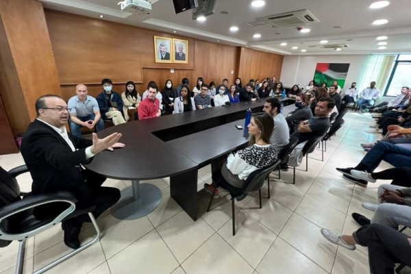 أطلع عضو المجلس الثوري لحركة "فتح"، عضو اللجنة السياسية لمنظمة التحرير الفلسطينية أسامة القواسمي، اليوم الثلاثاء، وفدين أميركيين من طلاب جامعتي "جورج تاون" و"مينيسوتا"، على حقيقة الصراع الفلسطيني الإسرائيلي، وممارسات إسرائيل العنصرية، وتطبيقها الفعلي لنظام "الابارتهايد" ضد الشعب الفلسطيني.