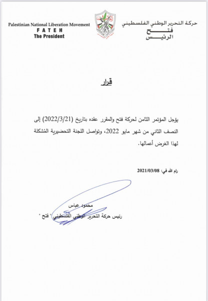أعلن منير الجاغوب، رئيس المكتب الاعلامي في مفوضية التعبئة والتنظيم لحركة (فتح)، أن الرئيس الفلسطيني محمود عباس، أصدر قراراً بتأجيل المؤتمر الثاني للحركة، والذي كان من المقرر عقده يوم 21 مايو.