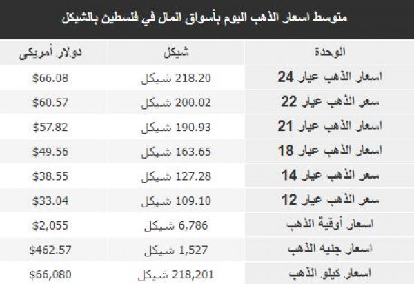 سُجلت أسعار الذهب في أسواق فلسطين، اليوم الأربعاء، فقًا للشيكل الإسرائيلي والدولار، على النحو التالي: