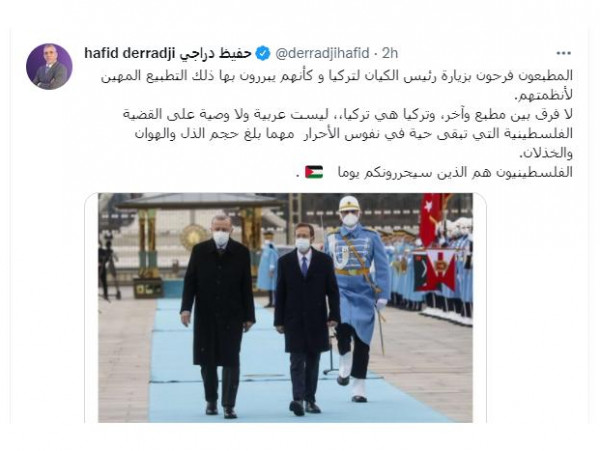 وكتب حفيظ دراجي "المطبعون فرحون بزيارة رئيس الكيان لتركيا و كأنهم يبررون بها ذلك التطبيع المهين لأنظمتهم".