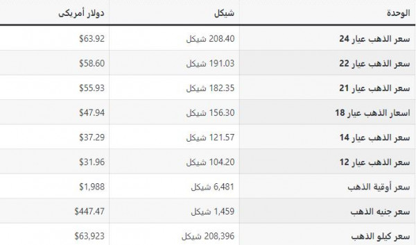 جاءت أسعار الذهب في الأسواق الفلسطينية اليوم الخميس، بحسب الشيكل الإسرائيلي والدولار، على النحو التالي: