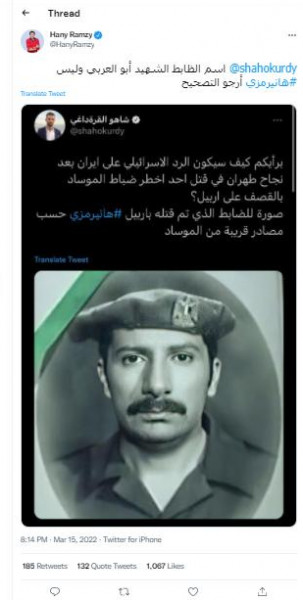 تناقل رواد مواقع التواصل الإجتماعي صورة للفنان المصري هاني رمزي من فيلم "أبو العربي" الذي قدمه، حيث ظن بعض رواد هذه المواقع أنه ضابط في الموساد، قتل جراء القصف الإيراني على أربيل.