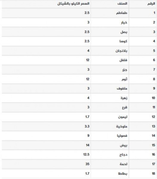 جاءت أسعار الخضروات والدجاج واللحوم في قطاع غزة اليوم الخميس، على النحو التالي: