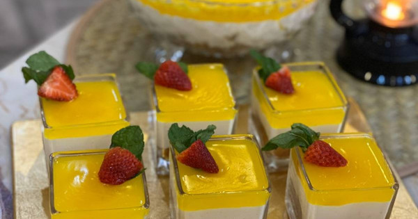 ضعي الطبق في الثلاجة لمدة 3 ساعات قبل التقديم وعند التقديم وزعي كمية من المانجو على الوجه للتزيين وقدميه باردًا.