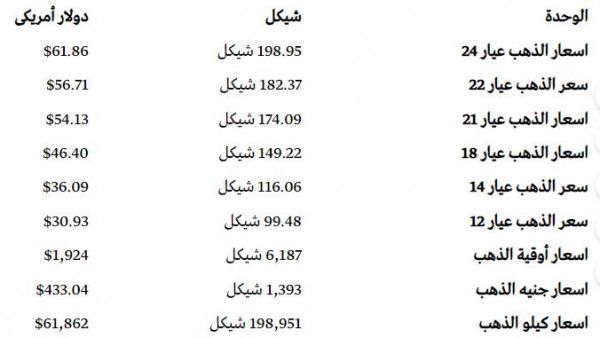 جاءت أسعار الذهب في الأسواق الفلسطينية، اليوم الأربعاء، وفقًا للشيكل الإسرائيلي والدولار الأمريكي على النحو التالي: