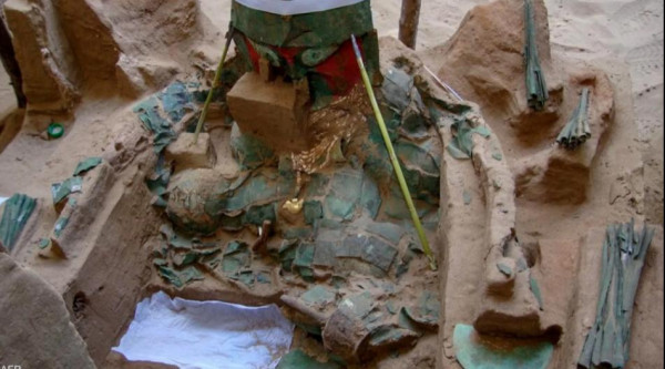 واحتوى النعش الذي عثر عليه علماء الآثار على قناع ذهبي وقطعة صدرية برونزية كبيرة، وقطع أخرى تشهد على مكانة الشخص المدفون، الذي وجده علماء الآثار جالسا القرفصاء.