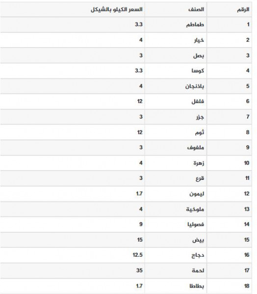 جاءت أسعار الخضروات والفواكه والدجاج واللحوم في قطاع غزة صباح اليوم السبت، كما يلي: