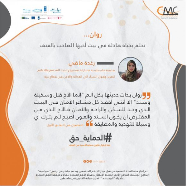 تم إنجاز هذه المادة الصحفية من قبل مركز الإعلام المجتمعي، وبدعم مباشر من برنامج (سواسية) البرنامج المشترك لبرنامج الأمم المتحدة الإنمائي وهيئة الأمم المتحدة للمرأة ومنظمة الأمم المتحدة للطفولة (يونيسيف): تعزيز سيادة قانون في فلسطين.