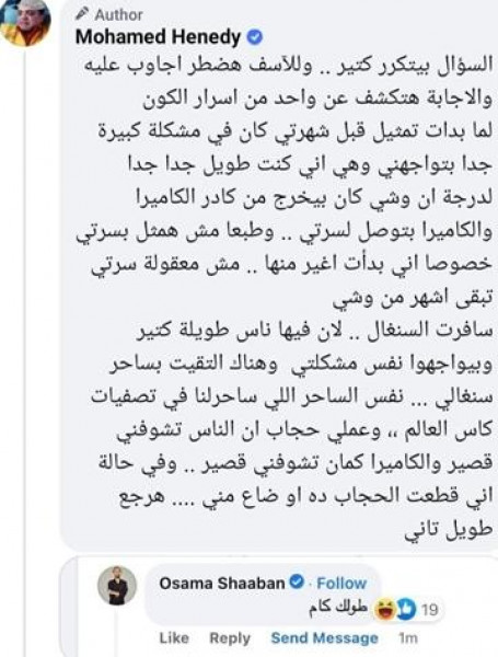 و إختتم هنيدي إجابته عن السؤال الذي حير عدد كبير من متابعيه، حيث قال عن طوله: " السؤال بيتكرر كتير، وللآسف هضطر أجاوب عليه والاجابة هتكشف عن واحد من أسرار الكون، فلما بدات تمثيل قبل شهرتي كان في مشكلة كبيرة جدا بتواجهني، وهي أنني كنت طويل جدا جدا لدرجة أن وشي كان بيخرج من كادر الكاميرا، والكاميرا بتوصل لسرتي، وطبعا مش همثل بسرتي خصوصا أنني بدأت أغير منها، مش معقولة سرتي تبقى أشهر من وشي".