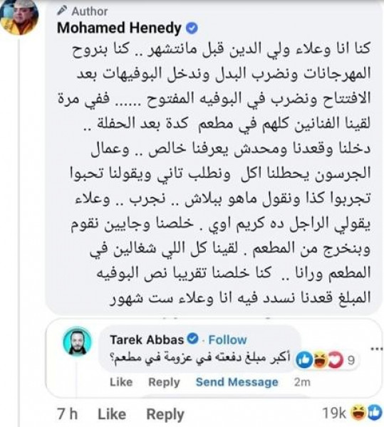 و أضاف" ففي مرة لقينا الفنانين كلهم في مطعم كدة بعد الحفلة، دخلنا وقعدنا ومحدش يعرفنا خالص، وعمال الجرسون يحطلنا أكل ونطلب تاني، ويقولنا تحبوا تجربوا كذا ونقول ماهو ببلاش، نجرب، وعلاء يقولي الراجل ده كريم أوي".