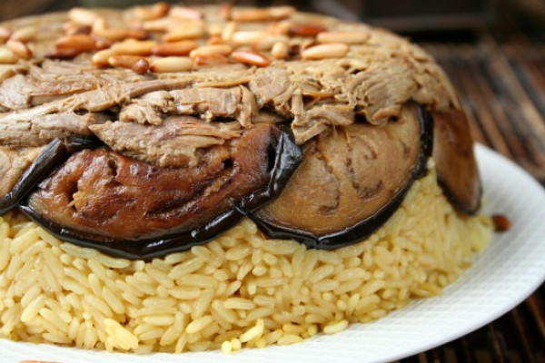 رشي بهارات المقلوبة على اللحم والطماطم.