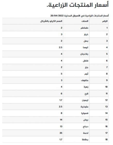 شؤون فلسطينية تعرف على أسعار الخضراوات واللحوم في أسواق غزة 2022-04-20 توضيحية رابط مختصر: تابعنا أيضا عبر انستجرام instagram/alwatanvoice جاءت أسعار الخضروات والفواكه والدجاج واللحوم في قطاع غزة، اليوم الأربعاء، كما يلي: