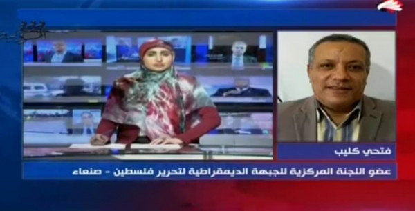 استضافت قناة الساحات اليمنية، عضو المكتب السياسي للجبهة الديمقراطية لتحرير فلسطين، فتحي كليب في حديث عن العدوان الاسرائيلي ضد الشعب الفلسطيني وتداعياته، فأشار إلى أن "ما يحدث اليوم من عدوان على في القدس وفي مختلف مدن وقرى الضفة الغربية ليس سوى محاولة لترميم صورة الأجهزة الأمنية الصهيونية التي بات واضحًا انها تترنح اليوم بفعل العمليات الفدائية وبفعل جدية المقاومة ورسائلها المتعددة بانها جاهزة للدفاع عن الشعب والارض الفلسطينية".