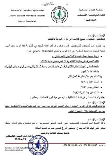 وفيما يلي بيان اتحاد المعلمين: