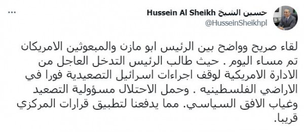 وقال الشيخ في تغريدة له على صفحته في موقع (تويتر)، مساء اليوم الخميس: "لقاء صريح وواضع بين الرئيس أبو مازن والمبعوثين الأمريكان، تم مساء اليوم الخميس".