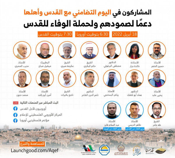 نظمت مؤسسة أوروبيون من أجل القدس وحملة الوفاء للقدس يوم تضامني مع القدس وأهلها؛ دعما لصمودهم والتبرع للحملة عبر التقنية المرئية بمشاركة شخصيات إسلامية وعربية من القدس وأوروبا والمغرب العربي.