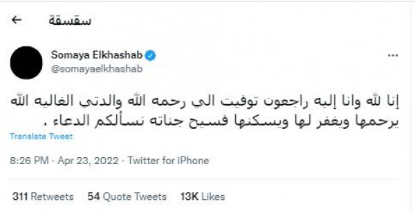 وأعلنت الفنانة سمية الخشاب، عن خبر وفاة والدتها عبر حسابها الخاص على تطبيق (تويتر)، حيث قالت: "إنا لله وإنا إليه راجعون توفيت إلى رحمة الله والدتي الغالية الله يرحمها ويغفر لها ويسكنها فسيح جناته نسألكم الدعاء".