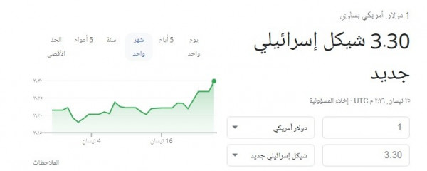 ارتفع سعر صرف الدولار الأمريكي مقابل الشيكل الإسرائيلي، بشكل حاد مساء اليوم الإثنين.