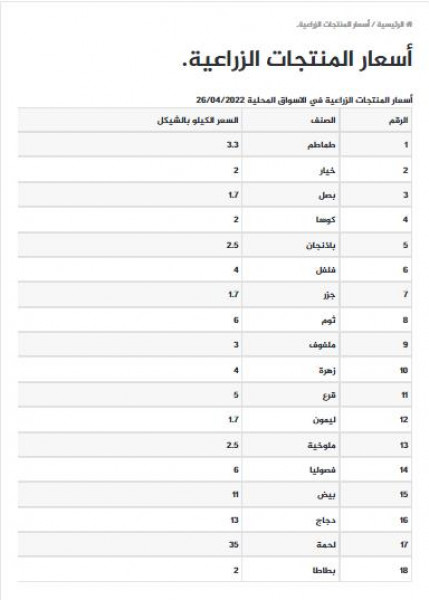 جاءت أسعار الخضروات والفواكه والدجاج واللحوم في قطاع غزة، اليوم الخميس، كما يلي: