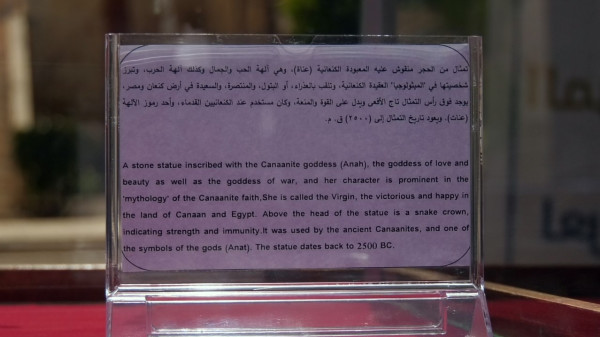 وبحسب وزارة السياحة والآثار في غزة، فإن هذا التمثال الكنعاني يعود للمعبودة الكنعانية "عناة" وهي آلهة الحب والجمال والحرب، حسب الميثولوجيا والعقيدة الكنعانية ،وتلقب بالمنتصرة والسعيدة ويعود تاريخه إلى 2500 سنة قبل الميلاد .