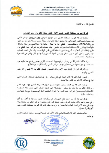 قالت شركة كهرباء محافظة القدس، أنها تسلّمت، أمس الإثنين، الإنذار الثاني بقطع الكهرباء عن المناطق التي تغطيها.