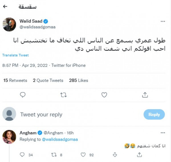 وتفاعلت أنغام مع منشور سعد وردت على تغريدته قائلة: "أنا كمان شفتهم".