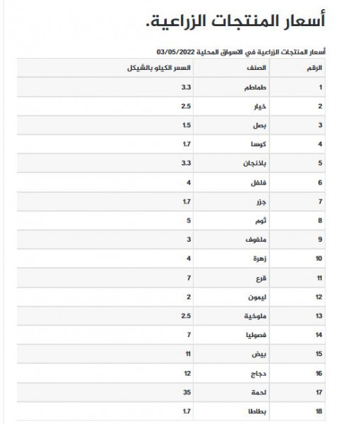 جاءت أسعار الخضروات واللحوم في أسواق قطاع غزة، اليوم الإثنين، على النحو التالي:
