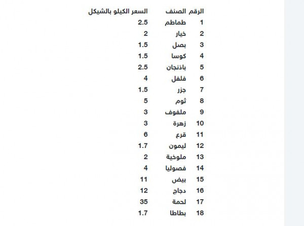 وجاءت أسعار الخضروات والدجاج واللحوم في الأسواق بغزة، كما يلي: