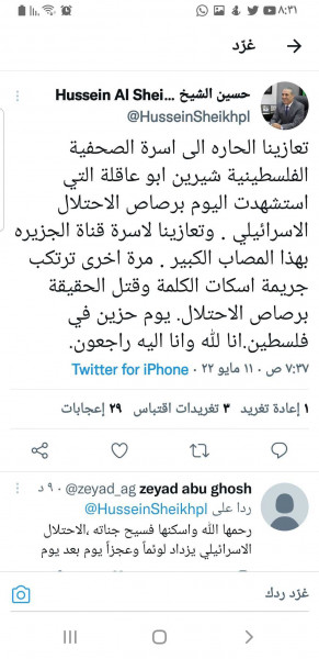 وأضاف الشيخ في تصريح مقتضب له عبر (تويتر): "كما وتعازينا الحارة إلى أسرة قناة (الجزيرة) بهذا المصاب الكبير"، متابعاً: "مرة أخرى ترتكب جريمة إسكات الكلمة وقتل الحقيقة برصاص الاحتلال، يوم حزين في فلسطين".