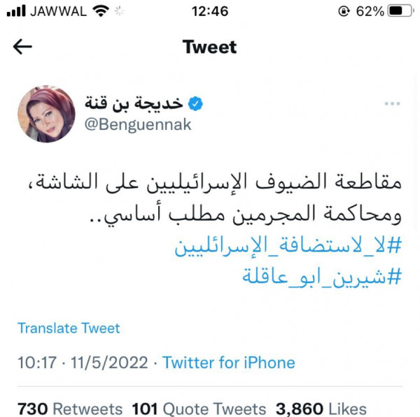 وقالت في تغريدة لها عبر حسابها موقع التواصل الاجتماعي (تويتر)، "مقاطعة الضيوف الإسرائيليين على الشاشة، ومحاكمة المجرمين مطلب أساسي".