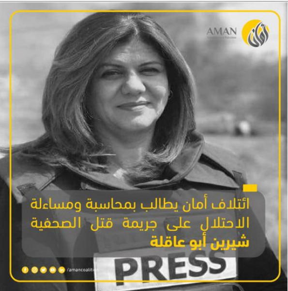 طالب الائتلاف من أجل النزاهة والمساءلة (أمان) المجتمع الدولي والمؤسسات الدولية بمساءلة ومحاسبة سلطات الاحتلال الاسرائيلي على جرائم الحرب التي يرتكبها في فلسطين المحتلة، والتي كانت آخرها جريمة القتل المفجعة للصحفية المقدسية شيرين أبو عاقلة مراسلة قناة (الجزيرة)، إثر إطلاق قناص من جنود الاحتلال الاسرائيلي النار على رأسها أثناء قيامها بعملها الصحفي وتغطيتها لاقتحام قوات الاحتلال مخيم جنين.