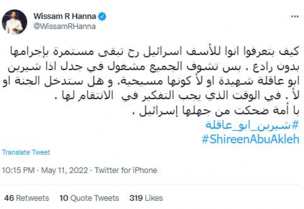 وأثار هذا الجدل حفيظة الفنان اللبناني وسام حنا، الذي نعى شيرين أبو عاقلة، وعبّر عن حزنه العميق لهذا الخبر المفجع، كما عبّر عن غضبه الشديد من الخوض في مثل هذه الأمور، حيث كتب على حسابه الرسمي على (تويتر): "كيف بتعرفوا إنو للأسف إسرائيل مستمرة بإجرامها بدون رادع..بس تشوف الجميع مشغول في جدل إذا شيرين أبو عاقلة شهيدة أو لا كونها مسيحية..وهل ستدخل الجنة أم لا..في الوقت الذي يجب فيه التفكير بالانتقام لها. وختم قوله بـ "يا أمة ضحكت إسرائيل من جهلها".