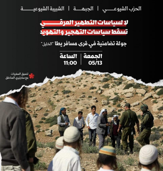أعلن الحزب الشيوعيّ والجبهة والشبيبة الشيوعيّة أنه سينظم، غدا الجمعة، جولة تضامنية إلى مسافر يطا والتي من المقرر أنّ تبدأ الساعة الـ 11:00 صباحًا وتشمل سفريات منسقة من عددٍ من المناطق.