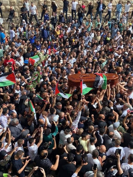 شيّعت جماهيرٌ غفيرة من أبناء الشعب الفلسطيني، جثمان الشهيدة الإعلامية شيرين أبو عاقلة، إلى مثواه الأخير في مقبرة بني صهيون، والتي استشهدت برصاص قوات الاحتلال الإسرائيلي خلال تغطيتها لاقتحام مخيم جنين.