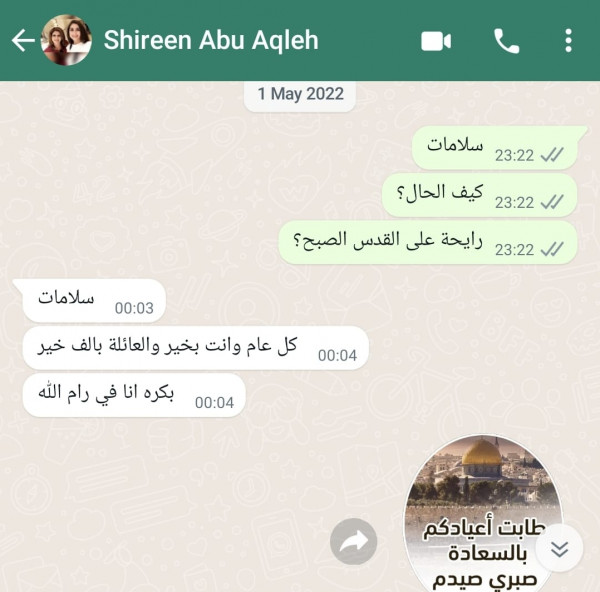 نشر عضو اللجنة المركزية لحركة فتح صبري صيدم، اليوم السبت، آخر رسالة كانت بينه وبين الشهيدة الصحفية شيرين أبو عاقلة.